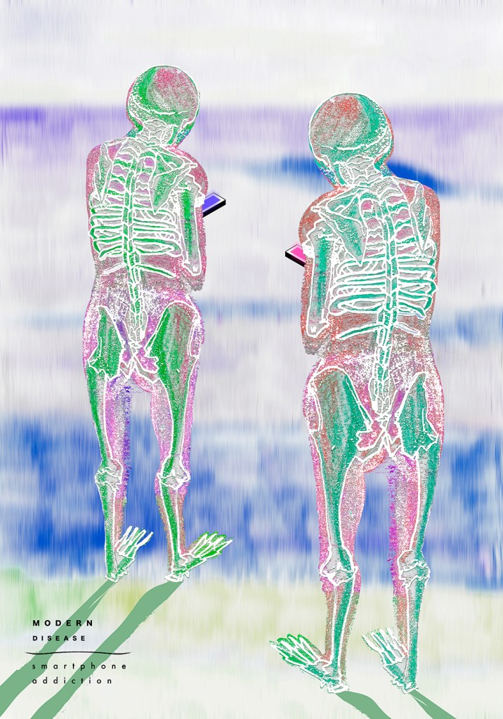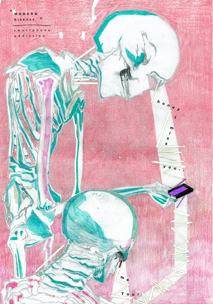Research from 2017 to 2019——modern diseases. Mainly focus on various diseases acquired by modern people as the center for research and visual creation. Living before the material and medical facilities, science and technology were not perfect, people suffered from diseases, famines and other problems, but in the modern era with sufficient material and advanced technology, people’s diseases have changed from visible to invisible” “Modern diseases”, such as skin and psychological problems caused by excessive dependence on the Internet, mobile phones, tobacco…. which lead to a series of life and mental fatigue, malaise, overdraft…. Visually, I mainly used painting, collage and other techniques to carry out experimental presentations, hoping to express and convey the physical and mental changes brought about by “modern diseases”.
